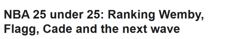 北京时间12月13日,ESPN评选了联盟25岁以下的25大球星,评选标准是球员的长期潜力。马刺的文班亚马居首,森林狼的爱德华兹排名第2,活塞的坎宁安位列第3。火箭共计3人上榜,分别是排在第5的申京、排在第6的阿门以及排在第25的谢泼德。